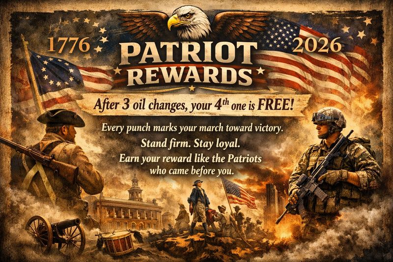 Patriots don’t just service their vehicles — they earn their honors. While you’re here, march over to see which S.T.R.I.P.E.S. you can earned and how each oil change advances you toward a FREE one. And as you move out, check how joining a Tier Unit can help you lock in even greater savings while keeping your vehicle mission‑ready.
